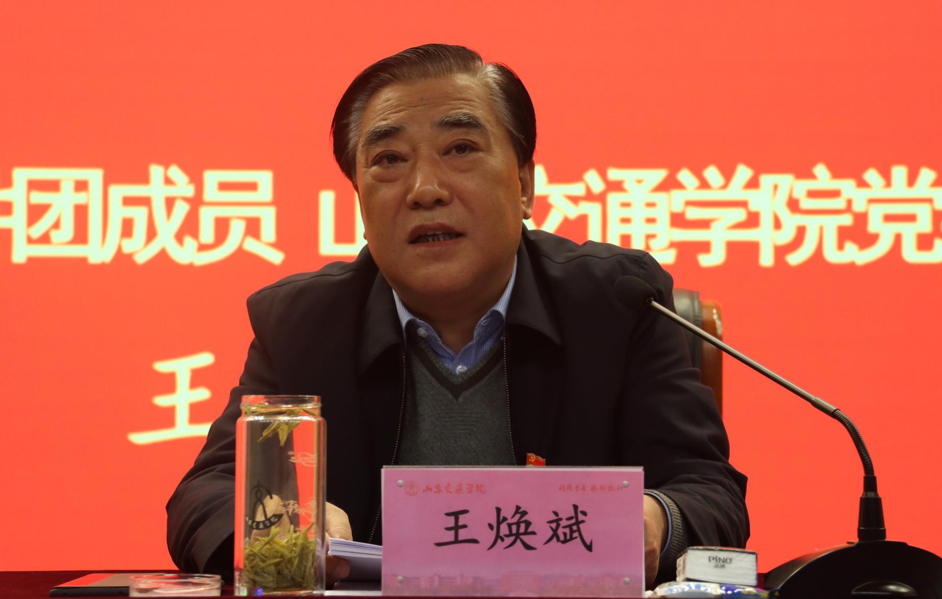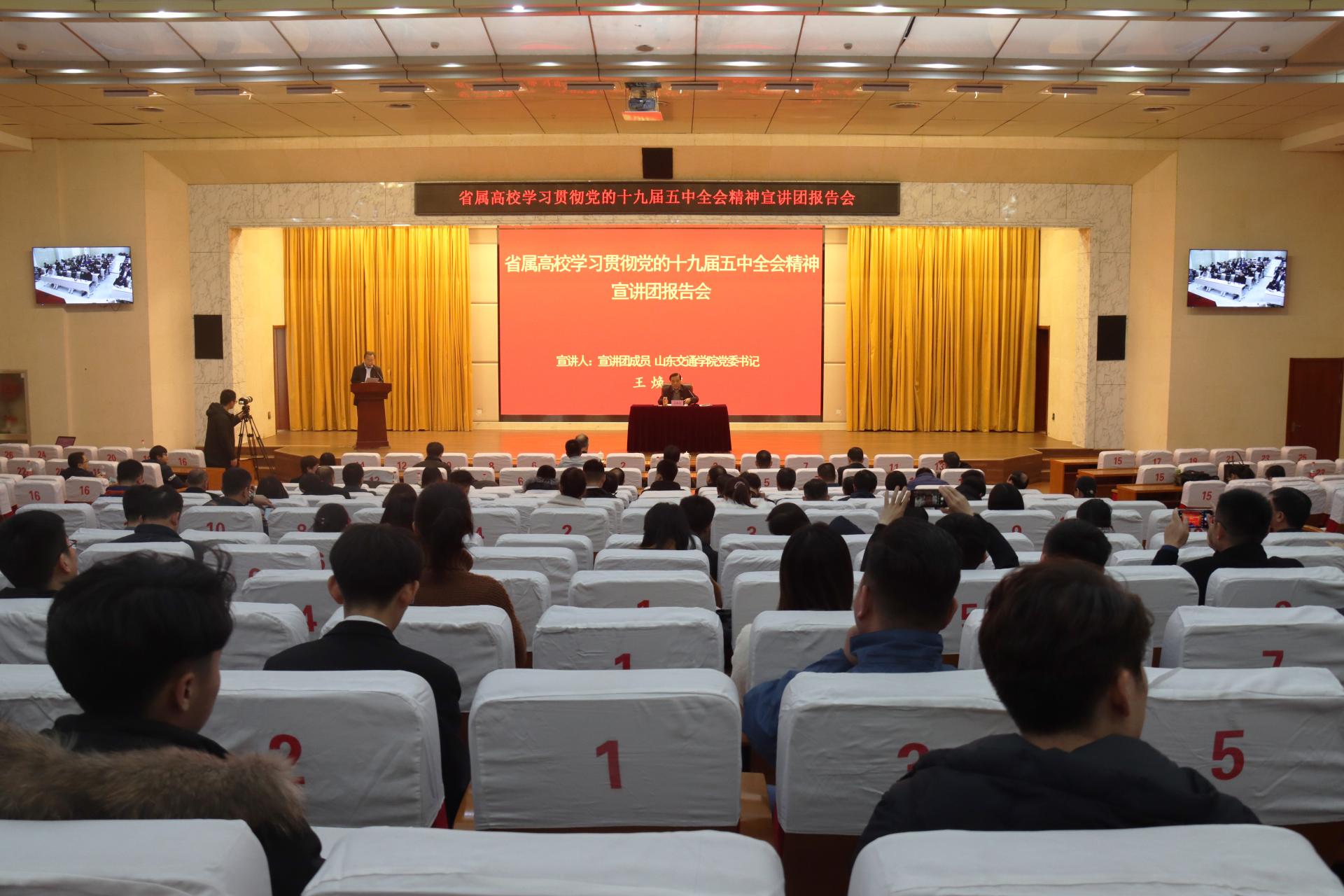 11月25日下午,学校在长清校区学术报告厅举行学习贯彻党的十九届五中全会精神报告会。省属高校学习贯彻党的十九届五中全会精神宣讲团成员、学校党委书记王焕斌作宣讲报告。党委副书记唐勇,纪委书记、监察专员贾洪江,党委委员、党委办公室(学校办公室)主任、党委统战部部长王晨晖,党委委员、党委宣传部部长周颜玲出席报告会。报告会由唐勇主持。