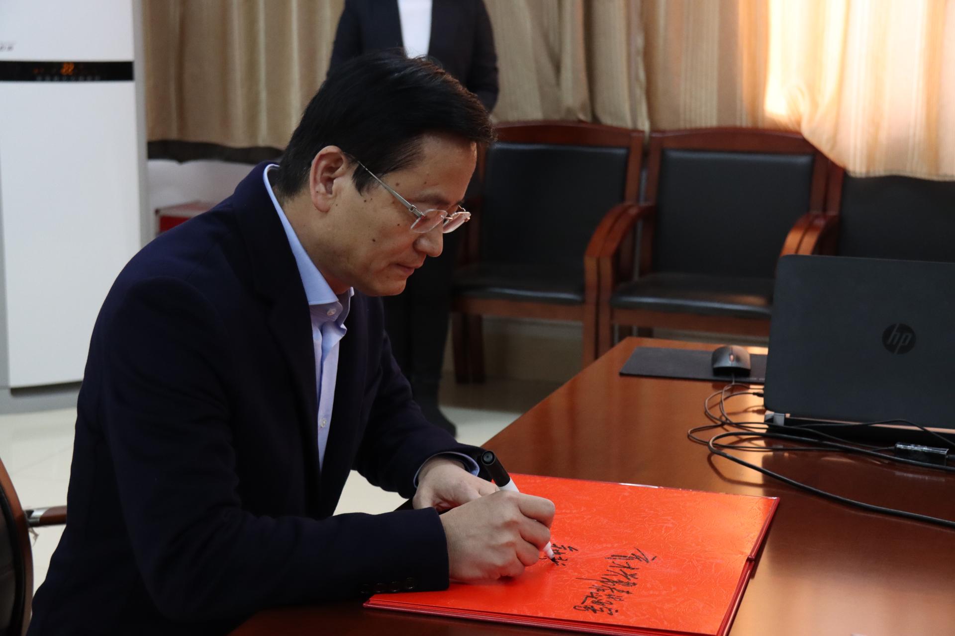 刘卫峰书写寄语并发表讲话。他表示,将继续传承交院人的优良传统,展现蓝海人的企业文化,发扬徽商的开放与奉献精神,感恩母校,助力学校建设发展。一是将以产教融合和科技转化为纽带,加强蓝海建设集团、安徽校友会与母校的互动联系,进一步促进科技成果转化,推动母校和企业发展再上新台阶。二是深化与母校的沟通合作,积极开展教育培训、推进联合办学,不断发挥校友会力量,用实际行动回馈母校,让合作之路越走越远,越走越精,越走越深。