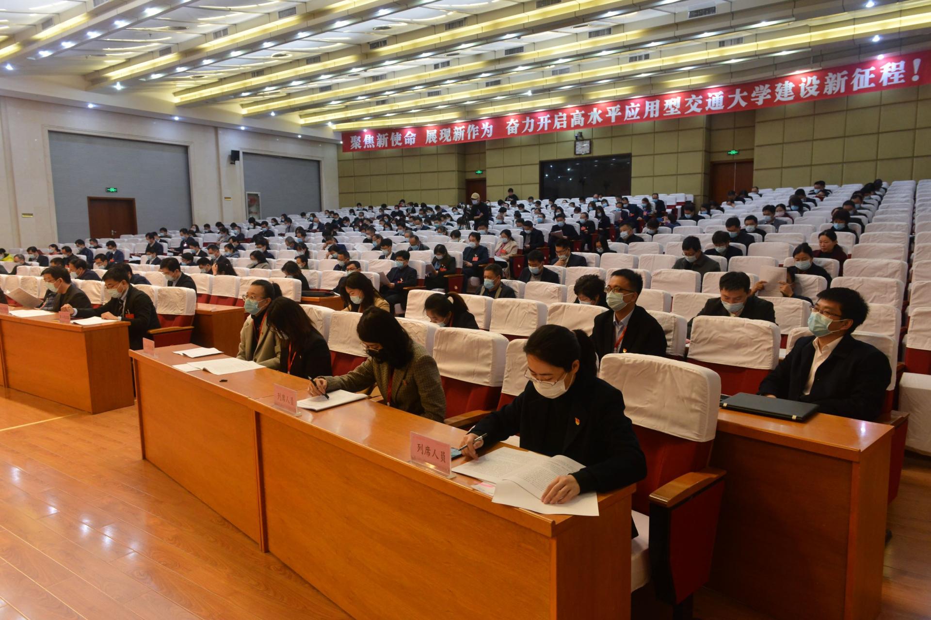 会场里悬挂着“聚焦新使命 展现新作为 奋力开启高水平应用型交通大学建设新征程”的巨幅标语,主席台上金色的党徽和鲜艳的红旗分外夺目。