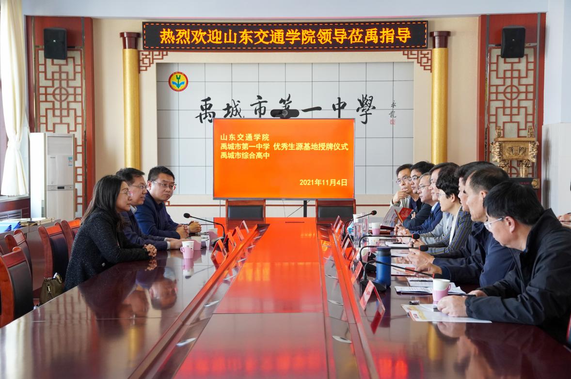 姜华平介绍了学校办学历史、学科专业特色、师资队伍与科研平台、人才培养和发展规划等情况。他希望,以此次优秀生源基地建设为契机,双方实现优势互补、资源共享、双向共赢。司红玉对姜华平一行的到来表示欢迎,希望双方能在更多领域进行深入合作。杨传斌、田金荣、张宝民分别介绍了全市教育总体情况、两所学校总体办学情况,期待通过双方共同努力,培养更多优秀人才,不断为我校输送优质生源。