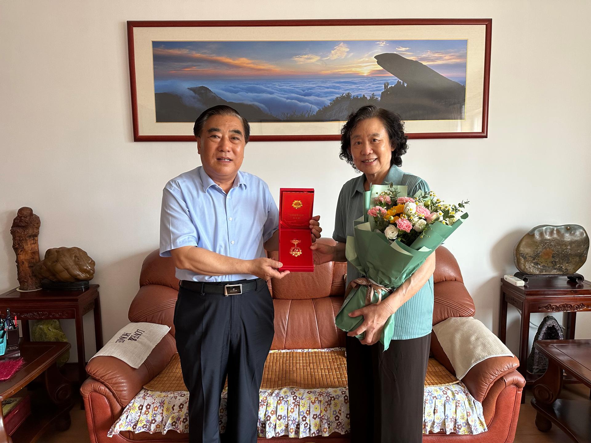 陈松岩在走访慰问中,与单淑芬同志亲切交谈,为她佩戴“光荣在党50年”纪念章,对她多年来为党和学校事业发展作出的贡献表示敬意和感谢。他讲述了学校的新发展新变化新成绩,征询了她对学校高质量发展的意见建议,同时希望老同志保重身体,一如既往地关心和支持学校各项事业的发展。
