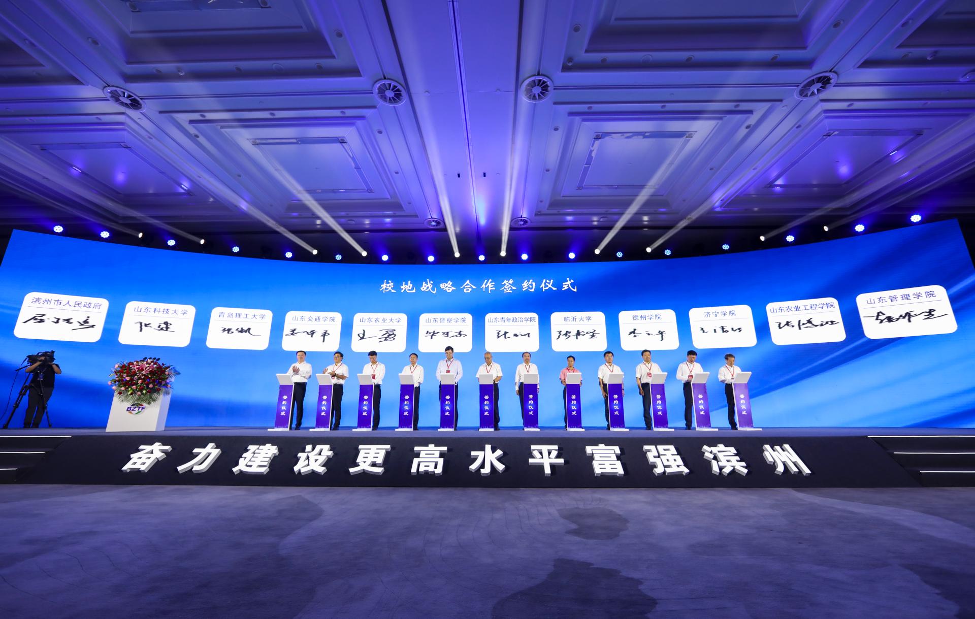 姜华平代表学校与滨州市政府签订了校地战略合作协议,希望双方深化合作,在开展科技创新合作、促进人才交流发展上下功夫,强化科技创新成果研究,加大紧缺人才培养力度,开展订单式人才培养,携手推动校企合作迈上新台阶,服务经济社会发展大局。