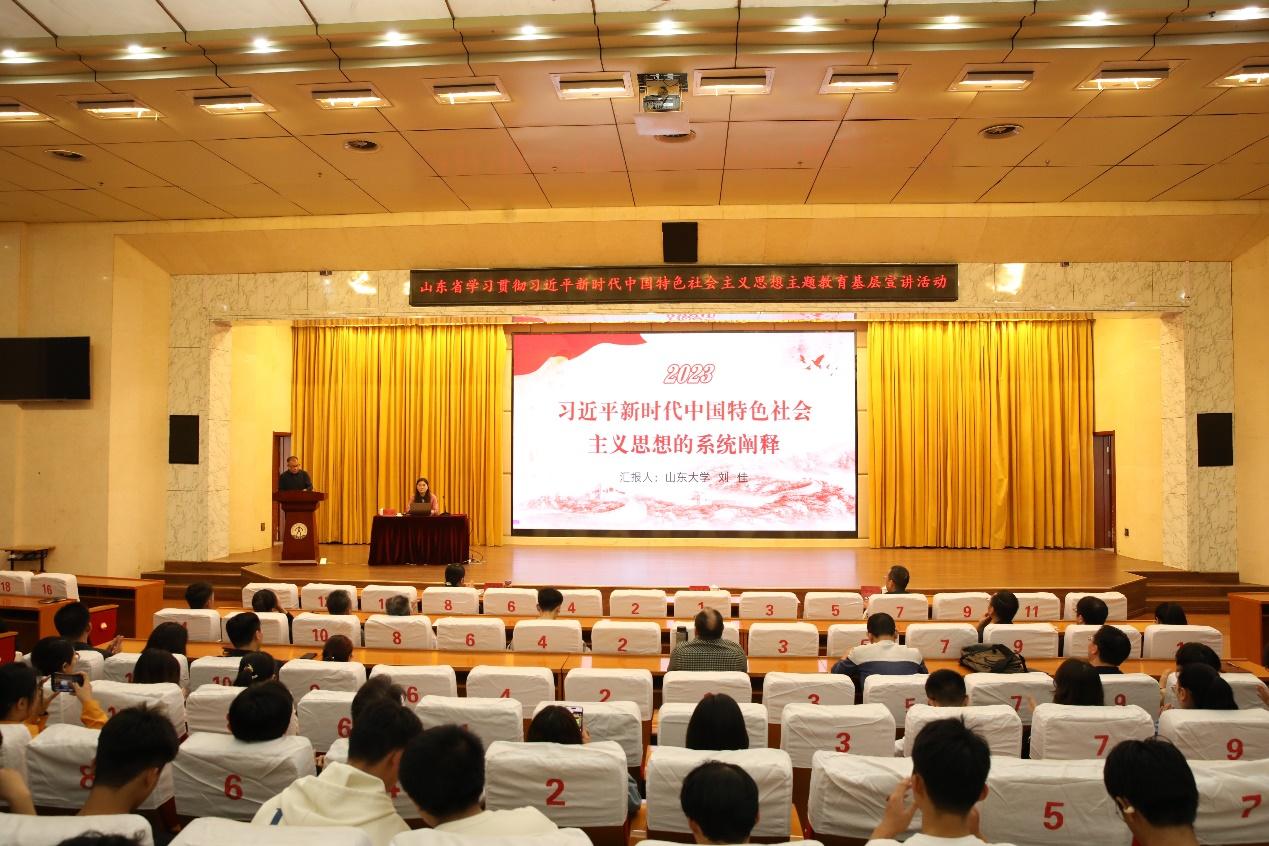 按照省委宣传部统一部署,10月25日,山东省学习贯彻习近平新时代中国特色社会主义思想主题教育基层宣讲走进我校。山东大学马克思主义学院思想道德与法治教研室党支部书记、教研室主任刘佳围绕“习近平新时代中国特色社会主义思想的系统阐释”开展主题宣讲。宣讲会由学校党委副书记李贞涛主持。
