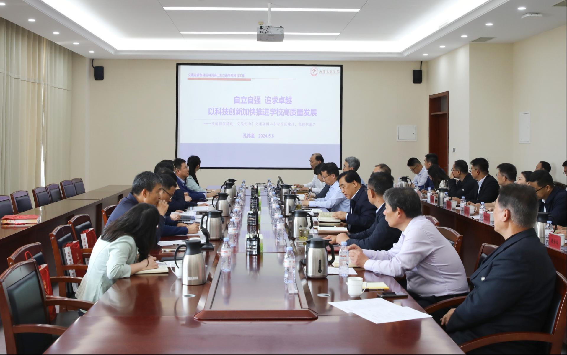 党委副书记、院长孔伟金以《自立自强、追求卓越,以科技创新加快推进学校高质量发展》为题,以“交通强国建设,交院何为?交通强国山东示范区建设,交院何能?”为主线,从学校发展概况、服务强国建设的总体情况、科技创新体系、特色科技成果、研究领域规划、交通强国试点任务建设等方面结合学校特色进行汇报。