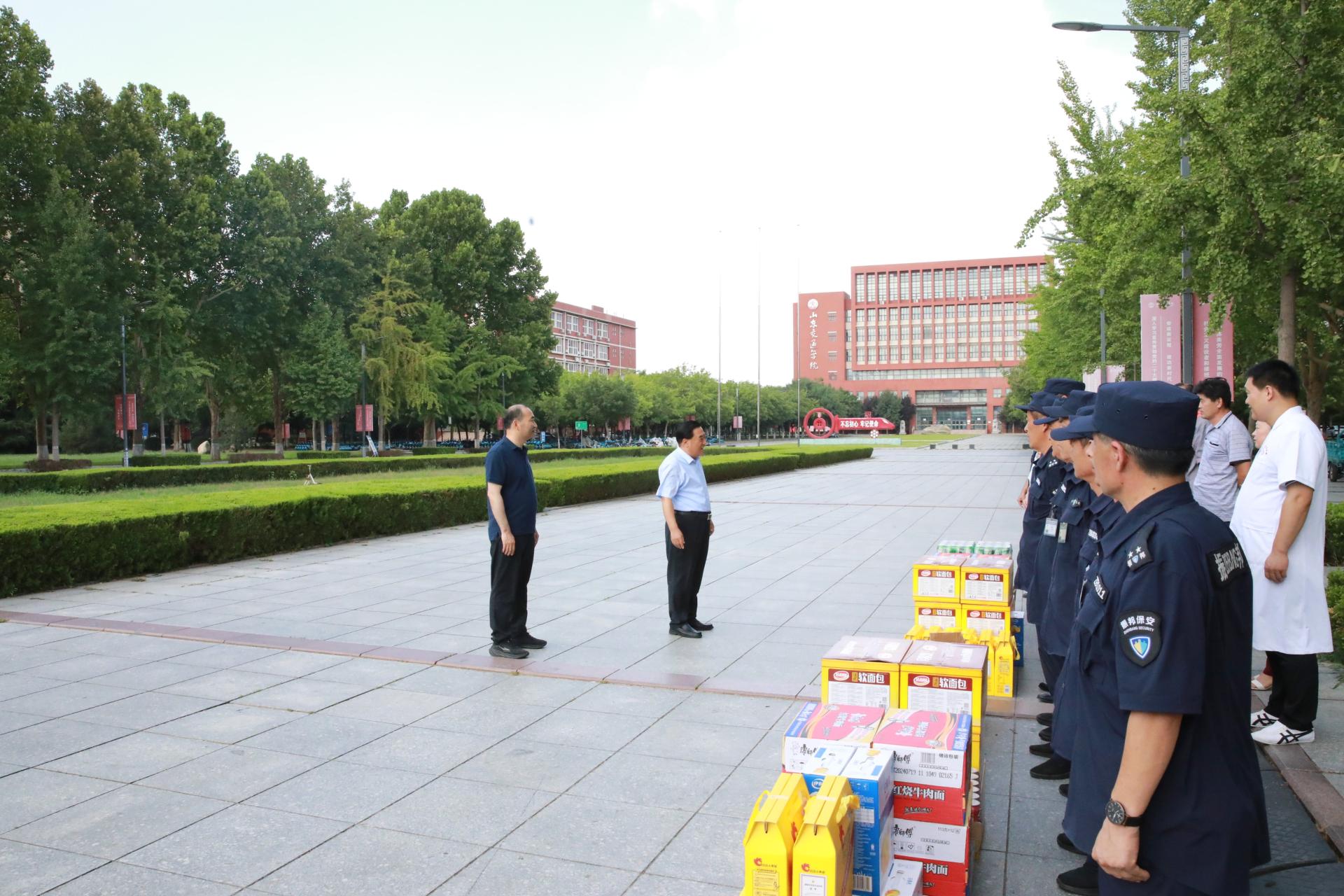 在长清校区东门,王焕斌、孔伟金与后勤管理处、安全管理处工作人员亲切交流,对高温酷暑仍旧坚守一线的员工表示感谢,嘱咐他们要保重身体、注意防暑降温,希望他们能够一如既往克服困难,以高度的工作责任心和扎实认真的工作态度为在校师生保驾护航。