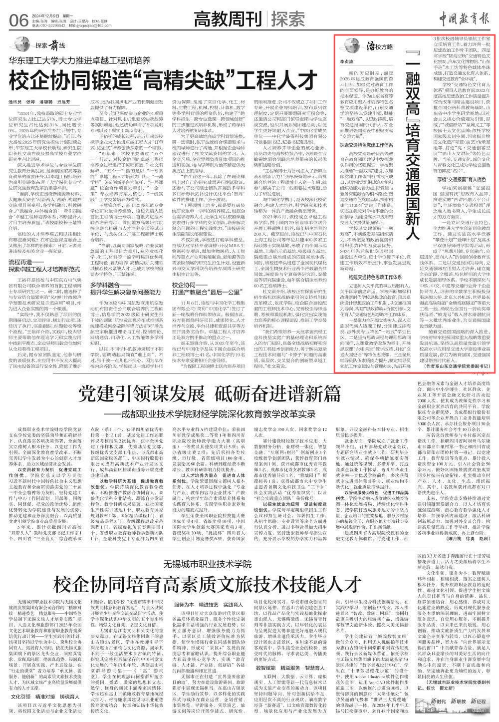 新闻网讯 12月9日,《中国教育报》刊发学校党委副书记李贞涛署名文章《“一融双高”培育交通报国新人》。文中指出,新的历史时期,锚定2035年建成教育强国的奋斗目标,加强党对教育工作的全面领导,是办好教育的根本保证。作为山东省高等教育应用型人才培养特色名校立项建设单位,山东交通学院坚持以党建引领,赋能“一融双高”,以思政铸魂,培育交通报国时代新人,在全面推进强国建设中积极贡献“交院力量”。