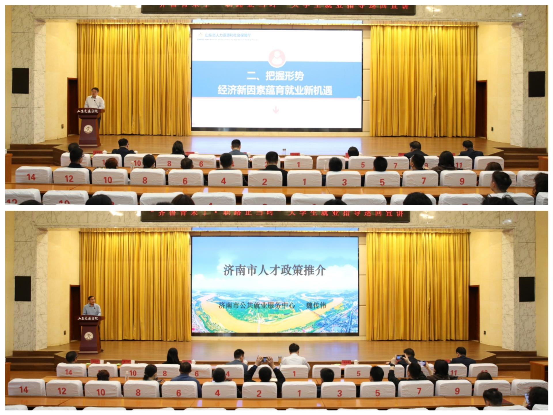 李秀领向长期以来关心支持学校发展的山东省人力资源和社会保障厅、济南市人力资源和社会保障局表示衷心感谢。他指出,学校始终将毕业生就业工作摆在突出位置,积极搭建平台、整合资源,助力学子实现高质量充分就业,希望以本次活动为契机,进一步强化政校合作,引导毕业生树立理性就业观,主动对接重点产业链紧缺岗位和基层项目,在服务国家战略中实现人生价值。