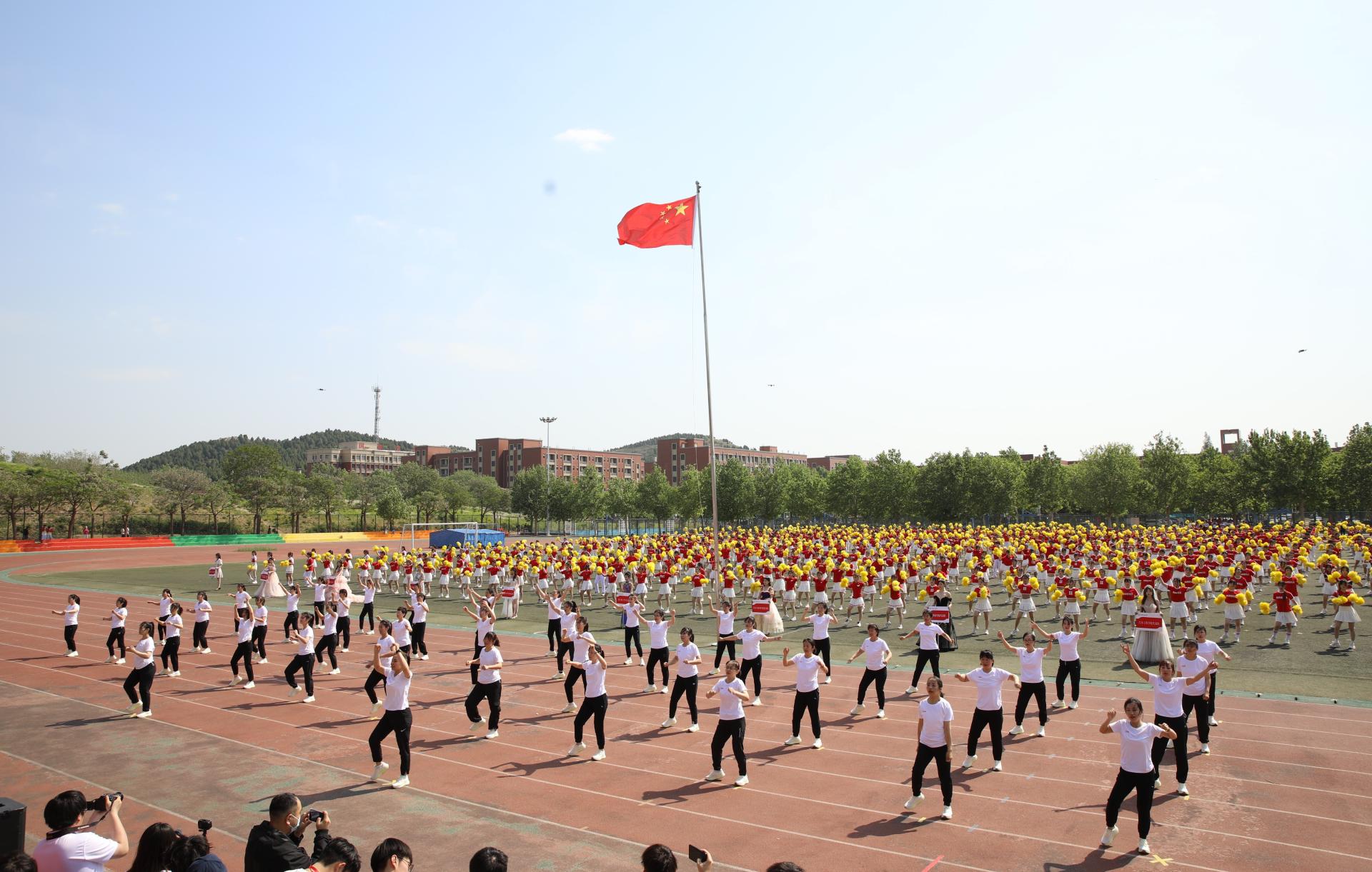 长清校区46名教职工、各二级学院780名大学生共同进行了《在灿烂阳光下》《We Rock》《时代感》三个篇章的团体操表演;威海校区学生合唱《相亲相爱》,并进行了舞狮表演。