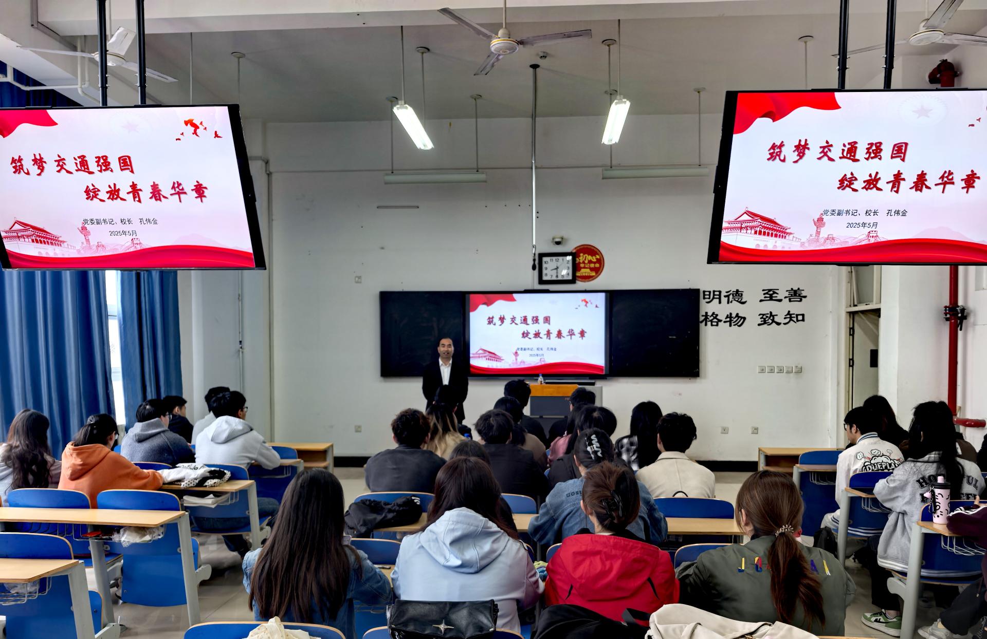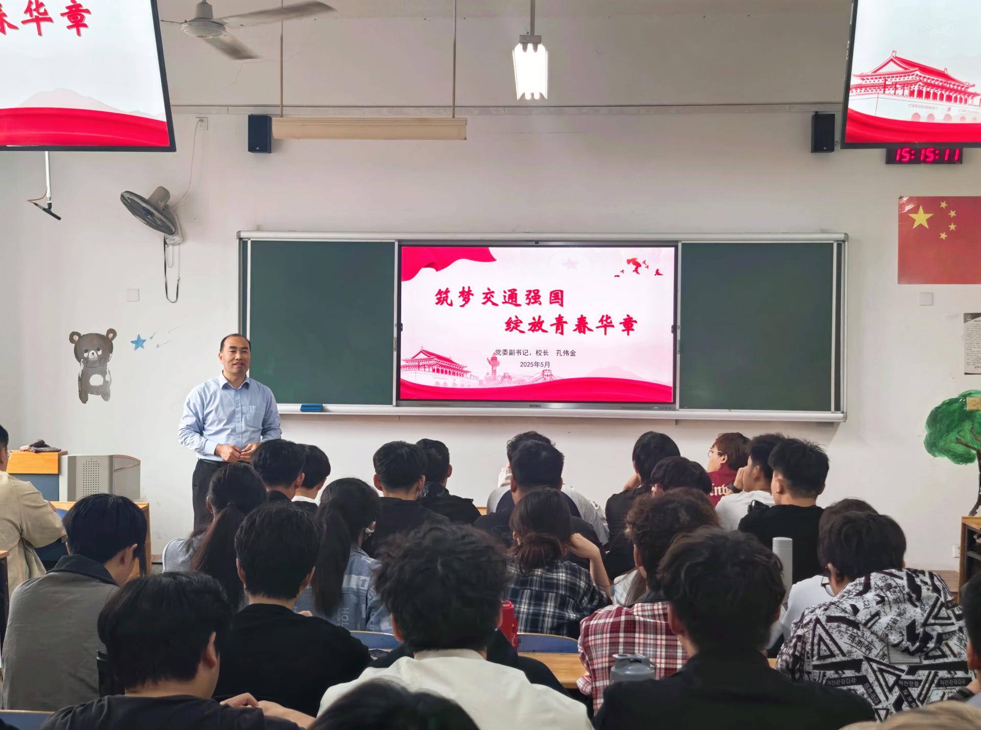 近日,学校党委副书记、院长孔伟金在长清校区1B406教室和威海校区2B112教室,以《筑梦交通强国 绽放青春华章》为题,为大数据专业和海事管理专业2022级本科生讲授思政课。
