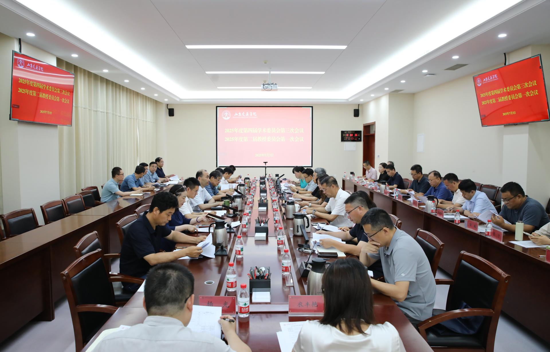 7月3日上午,学校在长清校区明德楼301会议室召开2025年度第四届学术委员会第三次会议和2025年度第二届教授委员会第一次会议。学校党委副书记、院长孔伟金,党委委员、副院长王保群,党委委员、副院长李秀领出席。会议由王保群主持。