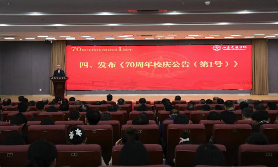 10月18日下午,学校在明德楼101报告厅举行70周年校庆倒计时一周年启动仪式。学校理事会成员、校友代表、合作企业家代表,学校党委领导班子成员王伟、孔伟金、李贞涛、刘世杰、王保群、徐静、王兴盈、刘庆波出席。仪式由党委委员、副院长王保群主持。