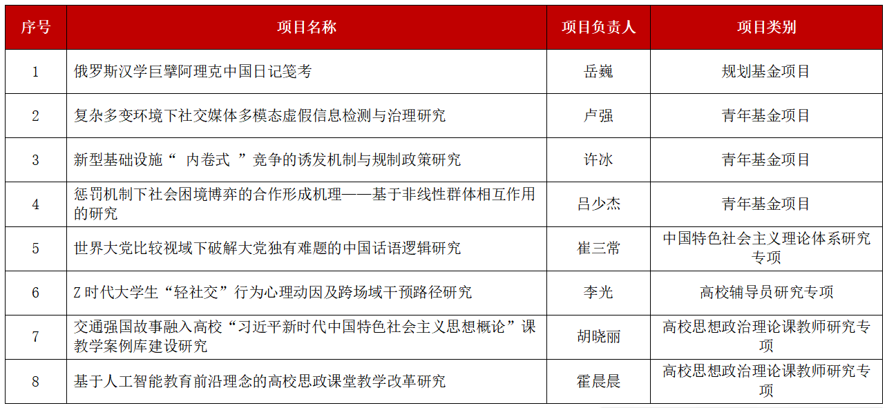 近日,教育部社会科学司公布了2025年度教育部人文社会科学研究一般项目和高校思想政治理论课教师研究专项立项名单,我校共8项课题获批立项。其中教育部人文社会科学研究一般项目6项(规划基金项目1项、青年基金项目3项、高校辅导员研究专项1项、中国特色社会主义理论体系研究专项1项),高校思想政治理论课教师研究专项一般项目2项。