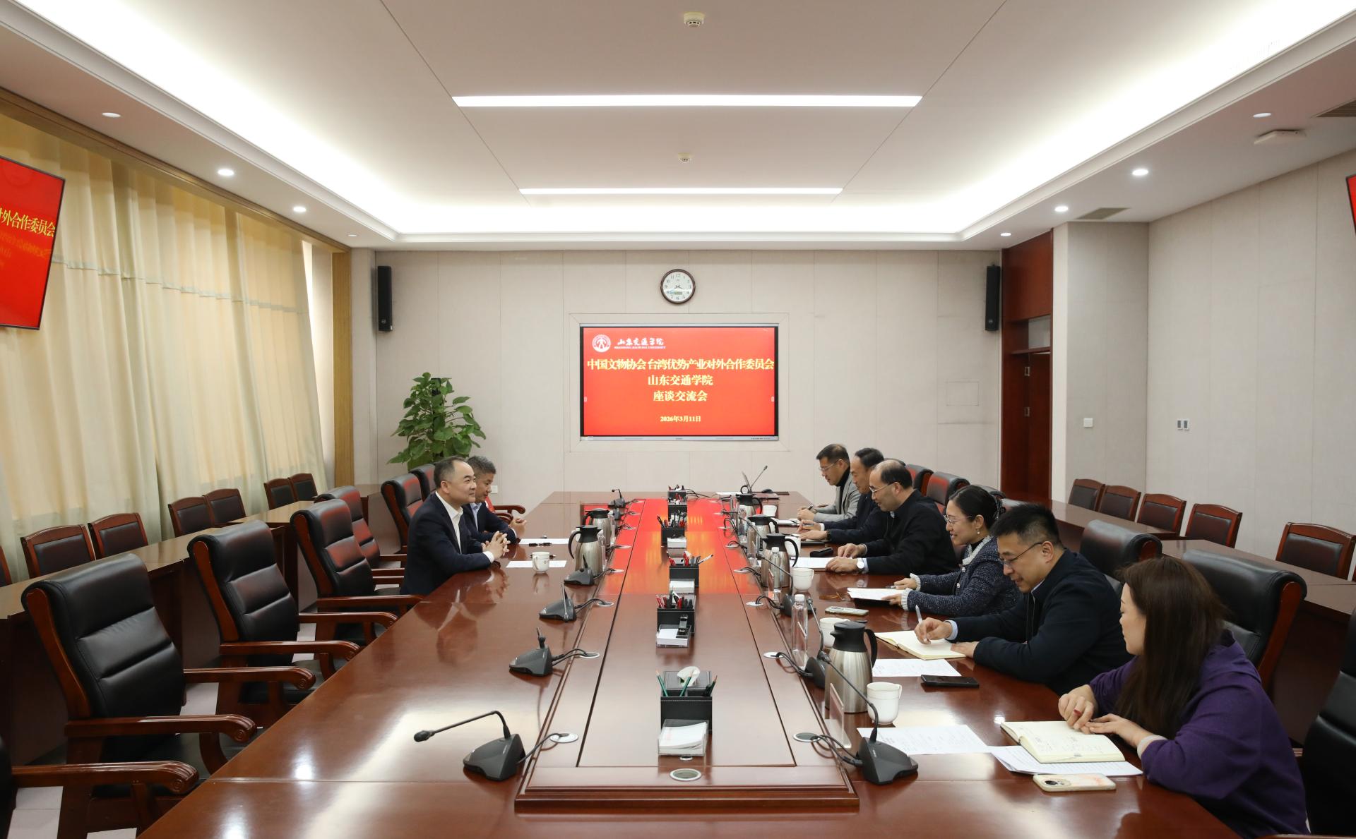 王新力感谢我校的热情接待,介绍了中国文物协会以文化为重要载体、台湾优势产业对外合作委员会以产业经济为抓手,在推动两岸融合发展方面取得的务实成果。他表示,未来将进一步深化鲁台交流合作,结合我校学科特色与办学定位,做好相关人才引荐工作,为学校高质量发展注入新活力。
